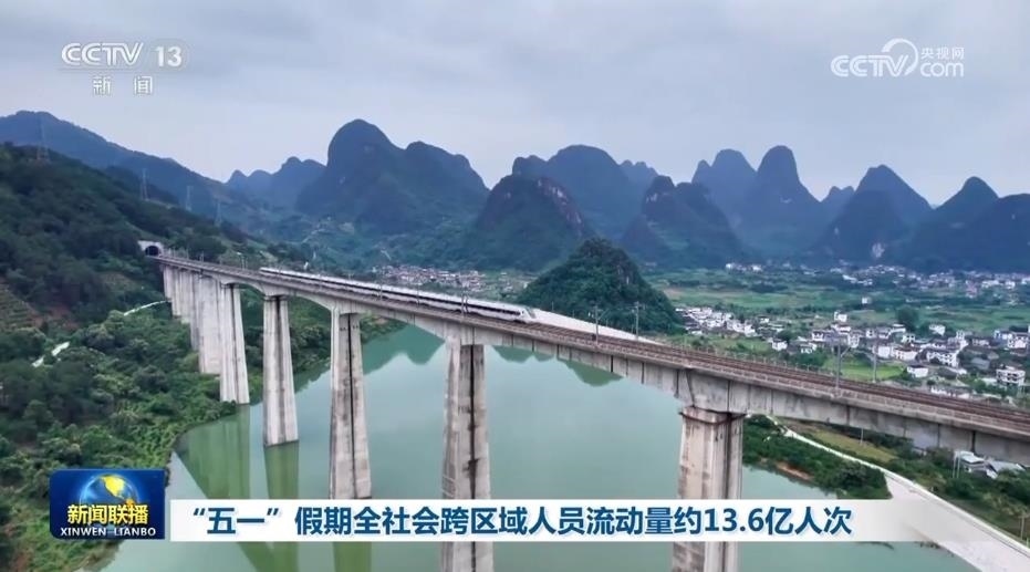 初步統(tǒng)計(jì)顯示,5月1日—5日,全社會跨區(qū)域人員流動量預(yù)計(jì)約13.6億人次,日均超2.7億人次,比2019年同期增長24.1%。