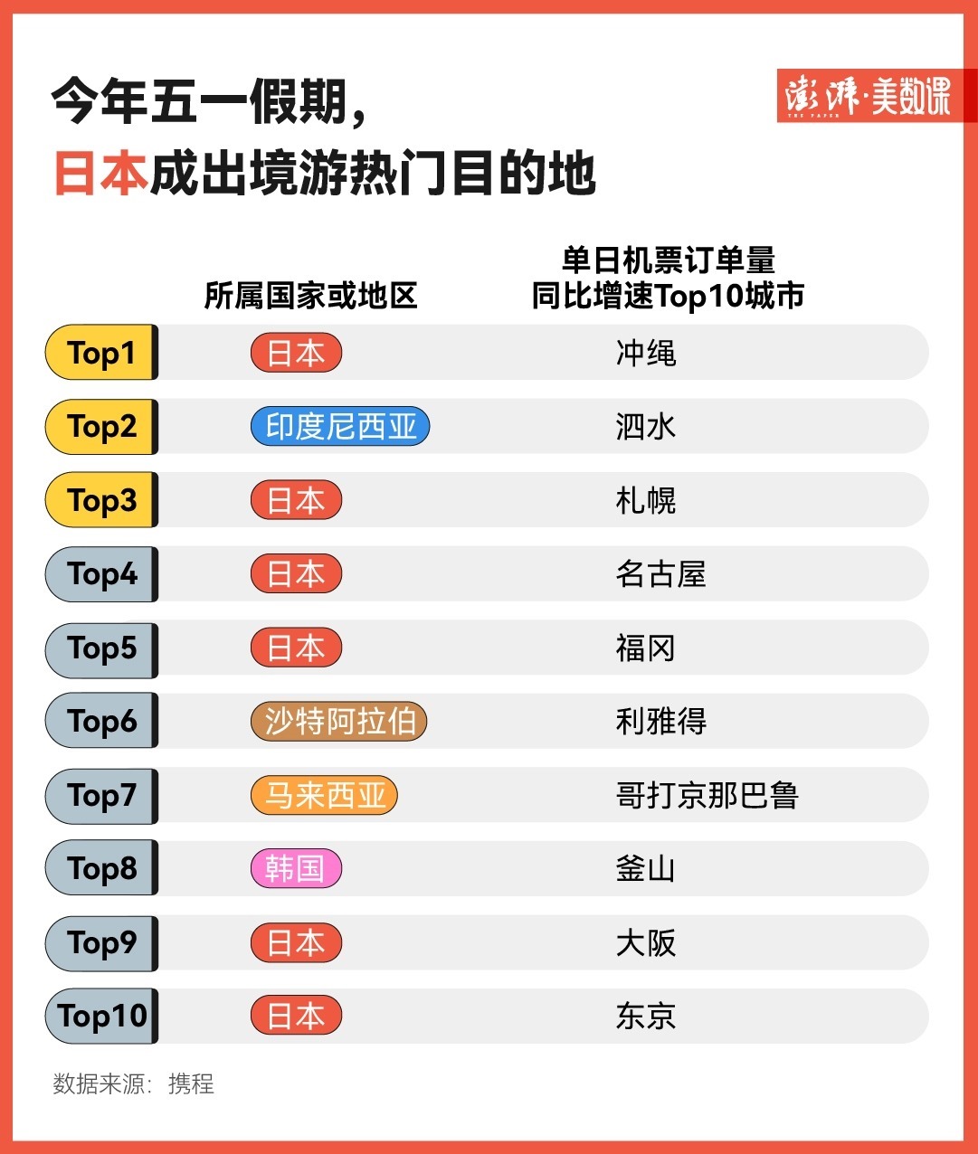 除了國內(nèi)旅游市場(chǎng)的火爆之外,“五一”出境游已經(jīng)加快復(fù)蘇。從攜程提供的數(shù)據(jù)看,今年“五一”假期,日本成了出境游熱門目的地——相比2023年同期,單日機(jī)票訂單量同比增速Top10的城市中,日本的沖繩、札幌、名古屋等城市分別占據(jù)了六個(gè)席位。