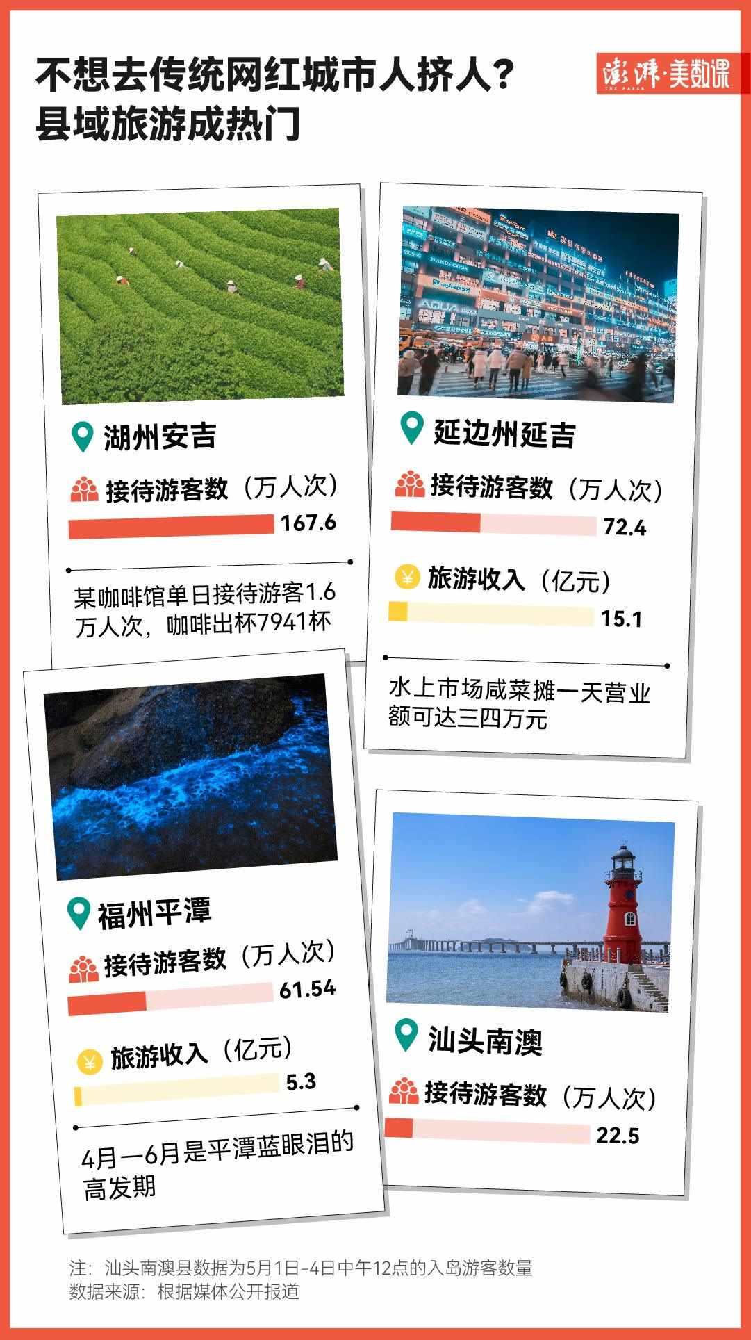 不僅如此,旅游下沉化的趨勢(shì)已經(jīng)來到了縣級(jí)市。湖州安吉在這個(gè)“五一”假期就收獲了167.6萬人次的游客數(shù)量。據(jù)“安吉旅游”公眾號(hào),當(dāng)?shù)啬晨Х瑞^單日接待游客1.6萬人次,咖啡出杯7941杯。