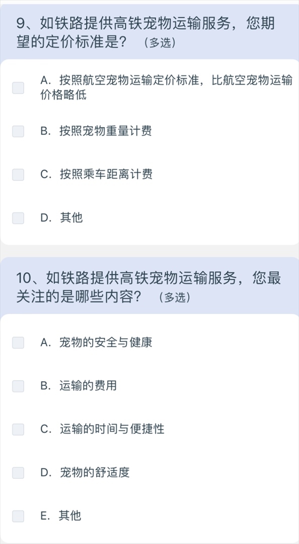 5月10日上午8點40分,澎湃新聞記者通過掃描網(wǎng)友分享的列車上的二維碼,進入12306系統(tǒng),選擇問卷·建議,進入“鐵路旅客高鐵寵物運輸”調(diào)查,共15個問題,涉及養(yǎng)寵類型、是否有攜帶寵物出行的需求、如果鐵路提供寵物運輸服務是否愿意嘗試等,以及為降低對其他旅客的影響,在高鐵寵物運輸更關注哪方面的防護;如鐵路提供高鐵寵物運輸服務,期望的定價標準;如鐵路提供高鐵寵物運輸服務,最關注的內(nèi)容;如果是非養(yǎng)寵人士,對高鐵寵物運輸有何建議等多方面問題。