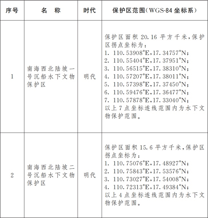 ·國務(wù)院核定公布南海西北陸坡一號(hào)、二號(hào)沉船水下文物保護(hù)區(qū)名單。