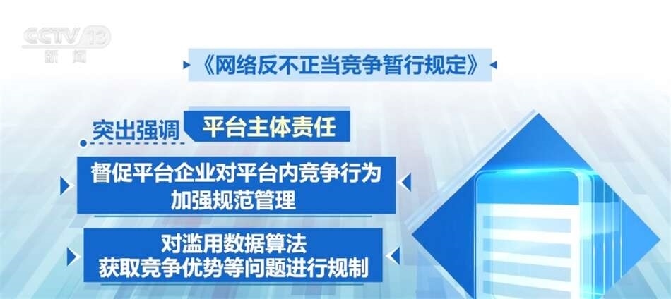 平臺(tái)企業(yè)掌握海量數(shù)據(jù),連接大量主體,既是網(wǎng)絡(luò)不正當(dāng)競爭監(jiān)管的重點(diǎn)對象,也是協(xié)同監(jiān)管的關(guān)鍵節(jié)點(diǎn)?!兑?guī)定》突出強(qiáng)調(diào)了平臺(tái)主體責(zé)任,督促平臺(tái)企業(yè)對平臺(tái)內(nèi)競爭行為加強(qiáng)規(guī)范管理,同時(shí)對濫用數(shù)據(jù)算法獲取競爭優(yōu)勢等問題進(jìn)行規(guī)制。