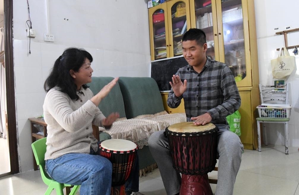 ?↑在位于廣西南寧市北湖北路的出租房里,何冬艷教兒子陽(yáng)陽(yáng)打鼓(2023年3月31日攝)。