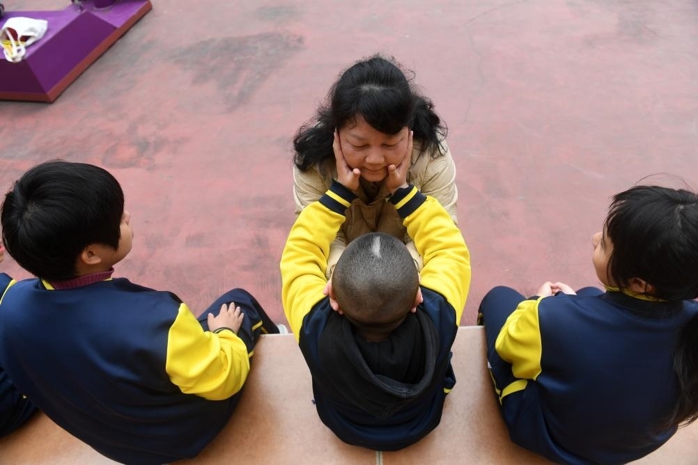 ?↑在廣西南寧高新區(qū)龍華學(xué)校,何冬艷和她照顧的孤獨(dú)癥學(xué)生在一起(2023年3月31日攝)。