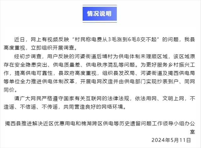 ·廣東揭陽一村電費從3毛漲到6毛8?官方回應(yīng):開展電網(wǎng)改造并實現(xiàn)抄表到戶、同網(wǎng)同價。