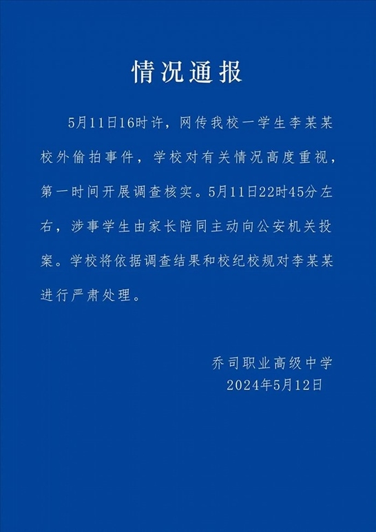 ·杭州市一職高通報學(xué)生校外偷拍女生裙底事件:涉事學(xué)生由家長陪同主動投案。