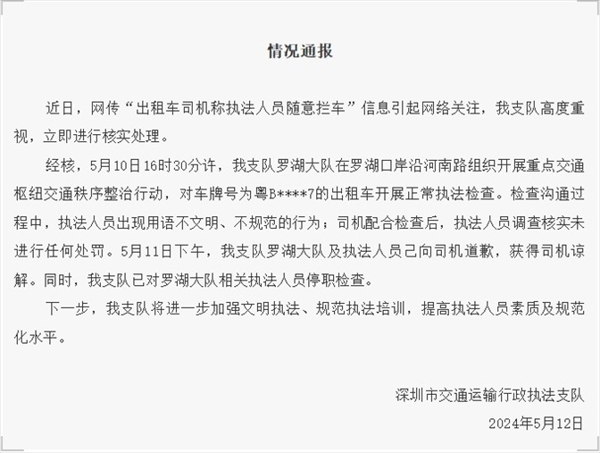 ·深圳出租車司機稱執(zhí)法人員隨意攔車?官方發(fā)布情況通報。