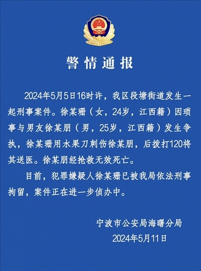 ·寧波警方通報女子因瑣事刺死男友:犯罪嫌疑人已被刑拘。