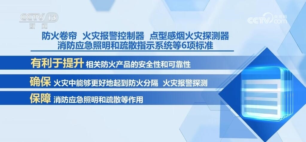防火卷簾、火災(zāi)報警控制器、點(diǎn)型感煙火災(zāi)探測器、消防應(yīng)急照明和疏散指示系統(tǒng)等6項(xiàng)標(biāo)準(zhǔn)有利于提升相關(guān)防火產(chǎn)品的安全性和可靠性,確保其在火災(zāi)中能夠更好地起到防火分隔、火災(zāi)報警探測,保障消防應(yīng)急照明和疏散等作用。應(yīng)急避難場所、救災(zāi)帳篷等4項(xiàng)標(biāo)準(zhǔn)可確保受災(zāi)人員得到更安全、更舒適的臨時安置。