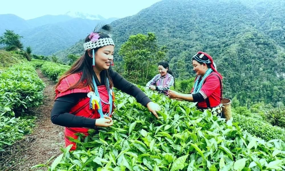 茶廠里人頭攢動(dòng)、歡聲笑語(yǔ),珞巴族女子穿梭在茶樹之間,單手輕輕一旋,嫩葉飄然入簍,不一會(huì)兒,簍里已是一片青綠。