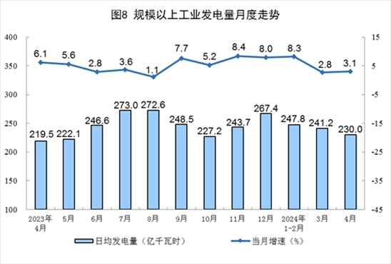 電力生產(chǎn)增速有所加快。4月份,規(guī)上工業(yè)發(fā)電量6901億千瓦時(shí),同比增長3.1%,增速比3月份加快0.3個(gè)百分點(diǎn);日均發(fā)電230.0億千瓦時(shí)。1—4月份,規(guī)上工業(yè)發(fā)電量29329億千瓦時(shí),同比增長6.1%。