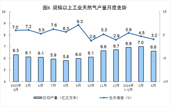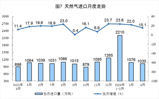 天然氣生產(chǎn)穩(wěn)定增長,進(jìn)口保持較快增長。4月份,規(guī)上工業(yè)天然氣產(chǎn)量198億立方米,同比增長3.2%,增速比3月份放緩1.3個(gè)百分點(diǎn);日均產(chǎn)量6.6億立方米。進(jìn)口天然氣1030萬噸,同比增長15.1%。
