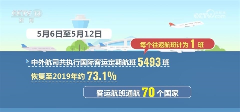 中國民航局數(shù)據(jù)顯示,5月6日至5月12日,中外航司共執(zhí)行國際客運定期航班5493班(每個往返航班計為1班),恢復至2019年約73.1%,客運航班通航70個國家。