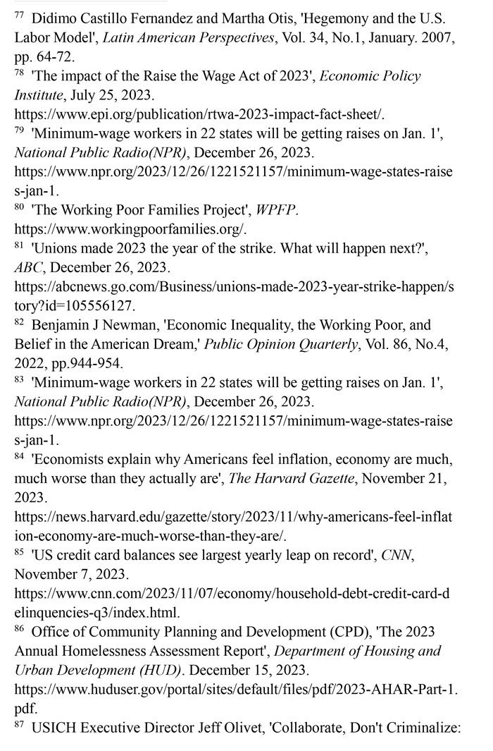 美國(guó)貧富分化加劇,“工作者貧困”現(xiàn)象凸顯,經(jīng)濟(jì)社會(huì)權(quán)利保障制度空轉(zhuǎn)。長(zhǎng)期以來(lái)的勞資分配差異懸殊,導(dǎo)致貧富差距達(dá)到1929年經(jīng)濟(jì)大危機(jī)以來(lái)最嚴(yán)重的程度。美國(guó)有1150萬(wàn)個(gè)低收入工薪家庭,聯(lián)邦最低時(shí)薪標(biāo)準(zhǔn)自2009年以來(lái)一直沒(méi)有上調(diào),2023年1美元購(gòu)買力已降至2009年的70%。低收入家庭難以支付食品、房租和能源等基本生活所需,無(wú)家可歸者超過(guò)65萬(wàn)人,創(chuàng)16年來(lái)新高。“工作者貧困”使辛勤勞作者的“美國(guó)夢(mèng)”破碎,導(dǎo)致2023年發(fā)生了21世紀(jì)以來(lái)波及范圍最廣的罷工潮。
