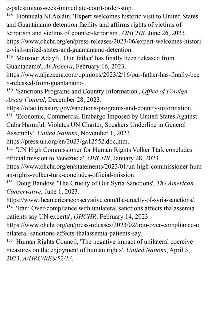 長(zhǎng)期濫施單邊制裁造成嚴(yán)重人道主義后果。自1950年以來(lái),美國(guó)使用的制裁次數(shù)居全球之首。根據(jù)美國(guó)財(cái)政部2023年12月28日公布的數(shù)據(jù),美國(guó)制裁的國(guó)家超過(guò)20個(gè)。(注150)第78屆聯(lián)合國(guó)大會(huì)發(fā)言人2023年11月1日指出,美國(guó)對(duì)古巴實(shí)施的經(jīng)濟(jì)、商業(yè)和金融封鎖違反了《聯(lián)合國(guó)憲章》,對(duì)古巴人民造成了毀滅性影響。(注151)聯(lián)合國(guó)大會(huì)2023年11月2日通過(guò)決議,再次敦促美國(guó)終止對(duì)古巴長(zhǎng)達(dá)60多年的經(jīng)濟(jì)、商業(yè)和金融封鎖,這是聯(lián)合國(guó)大會(huì)連續(xù)第31年通過(guò)類似決議。2023年1月28日,聯(lián)合國(guó)人權(quán)事務(wù)高級(jí)專員沃爾克·圖爾克在訪問(wèn)委內(nèi)瑞拉后表示,2017年以來(lái)美國(guó)施加的制裁加劇了委內(nèi)瑞拉的經(jīng)濟(jì)危機(jī),嚴(yán)重阻礙人權(quán)的實(shí)現(xiàn)。(注152)“美國(guó)保守派”網(wǎng)站2023年6月1日?qǐng)?bào)道,美國(guó)制裁進(jìn)一步加劇了敘利亞人民的貧困。敘利亞70%的人口面臨食物短缺,其中1200萬(wàn)人三餐不繼,290萬(wàn)人食不果腹。(注153)聯(lián)合國(guó)人權(quán)理事會(huì)單邊強(qiáng)制措施對(duì)人權(quán)負(fù)面影響問(wèn)題特別報(bào)告員阿萊娜·杜晗2023年2月14日指出,美國(guó)對(duì)伊朗的制裁減少了地中海貧血癥患者從國(guó)外進(jìn)口救命藥物的機(jī)會(huì),導(dǎo)致伊朗患者的并發(fā)癥和死亡率增加,是對(duì)健康權(quán)的侵犯。(注154)聯(lián)合國(guó)人權(quán)理事會(huì)2023年4月3日通過(guò)決議指出,單邊強(qiáng)制性措施會(huì)對(duì)目標(biāo)國(guó)家廣大民眾的人權(quán)產(chǎn)生深遠(yuǎn)影響,對(duì)窮人和處境最脆弱的人影響尤為嚴(yán)重。決議譴責(zé)某些大國(guó)繼續(xù)單方面適用單邊強(qiáng)制性措施。美國(guó)在該決議表決中投了反對(duì)票。(注155)