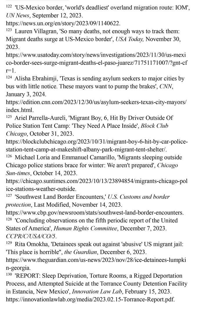 入境移民遭受酷刑及其他不人道待遇。2023財(cái)年,在美國(guó)南部邊境遭逮捕或驅(qū)逐的移民總數(shù)達(dá)240多萬(wàn)人,再創(chuàng)歷史新高。(注127)聯(lián)合國(guó)人權(quán)事務(wù)委員會(huì)對(duì)移民在美國(guó)受到長(zhǎng)時(shí)間的拘留表示擔(dān)憂,批評(píng)美國(guó)的拘留所條件惡劣,人滿為患,被拘押者無(wú)法獲得食物、水和醫(yī)療服務(wù),導(dǎo)致包括兒童在內(nèi)的許多人死亡;公共和私營(yíng)移民拘留設(shè)施存在性暴力、長(zhǎng)期單獨(dú)監(jiān)禁、虐待等侵犯人權(quán)問(wèn)題。(注128)英國(guó)《衛(wèi)報(bào)》網(wǎng)站2023年12月6日?qǐng)?bào)道,由美國(guó)私人監(jiān)獄公司CoreCivic運(yùn)營(yíng)的、位于佐治亞州蘭普金的斯圖爾特拘留中心存在長(zhǎng)期單獨(dú)監(jiān)禁、性虐待、醫(yī)療疏忽以及強(qiáng)迫勞動(dòng)等令人擔(dān)憂的問(wèn)題。(注129)創(chuàng)新法律實(shí)驗(yàn)室于2023年2月15日發(fā)布報(bào)告揭露,由CoreCivic運(yùn)營(yíng)的、位于新墨西哥州埃斯坦西亞的托蘭斯縣拘留所存在對(duì)被關(guān)押者實(shí)施酷刑現(xiàn)象。在夜間,每隔15分鐘就會(huì)有一名警衛(wèi)開(kāi)著收音機(jī)的最大音量走過(guò)這些房間,大聲地敲著門,并用手電筒強(qiáng)光照進(jìn)房間,吵醒任何可能睡著的人。在寒冷的天氣里,每個(gè)房間的通風(fēng)管道整夜都在吹冷空氣。一些人試圖用衛(wèi)生紙或毯子蓋住通風(fēng)口,但警衛(wèi)們拿走了用來(lái)阻擋冷空氣的任何東西。這些牢房里,廁所污水和糞便溢出,人們被迫睡在臭氣熏天的地板上。(注130)