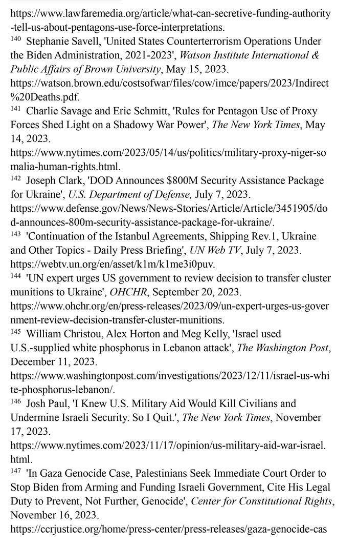持續(xù)向沖突地區(qū)提供武器。美國(guó)國(guó)防部2023年7月7日發(fā)布的新聞稿顯示,美國(guó)向?yàn)蹩颂m提供的價(jià)值8億美元的額外軍事援助中,包含大量集束彈藥。(注142)聯(lián)合國(guó)秘書(shū)長(zhǎng)副發(fā)言人哈克2023年7月7日回答記者提問(wèn)時(shí)表示,聯(lián)合國(guó)秘書(shū)長(zhǎng)安東尼奧·古特雷斯希望各國(guó)遵守《集束彈藥公約》,不要在戰(zhàn)場(chǎng)上繼續(xù)使用集束彈藥。(注143)聯(lián)合國(guó)人權(quán)高專辦網(wǎng)站2023年9月20日?qǐng)?bào)道,聯(lián)合國(guó)人權(quán)理事會(huì)酷刑和其他殘忍、不人道或有辱人格的待遇或處罰問(wèn)題特別報(bào)告員愛(ài)麗絲·吉爾·愛(ài)德華茲2023年7月向美國(guó)政府發(fā)出緊急信函,警告集束彈藥會(huì)對(duì)平民造成嚴(yán)重傷害。(注144)《華盛頓郵報(bào)》網(wǎng)站2023年12月11日?qǐng)?bào)道,美國(guó)每年流入以色列的軍火達(dá)數(shù)十億美元,以色列在10月對(duì)黎巴嫩南部的一次襲擊中使用了美國(guó)供應(yīng)的白磷彈藥,造成至少9名平民受傷。(注145)美國(guó)國(guó)務(wù)院政治軍事事務(wù)局前局長(zhǎng)喬?!けA_2023年10月18日在《紐約時(shí)報(bào)》網(wǎng)站發(fā)表專欄文章指出,美國(guó)每年向以色列提供至少38億美元軍事援助,加沙地帶最嚴(yán)重的人員傷亡大多是由美國(guó)提供的彈藥所導(dǎo)致,譴責(zé)這種軍事援助無(wú)視人權(quán)問(wèn)題。(注146)美國(guó)人權(quán)組織“憲法權(quán)利中心”2023年11月16日?qǐng)?bào)道,滅絕種族與死刑問(wèn)題專家威廉·沙巴斯指責(zé)美國(guó)未能履行防止種族滅絕的法律義務(wù),違反了習(xí)慣國(guó)際法和《防止及懲治滅絕種族罪公約》。(注147)