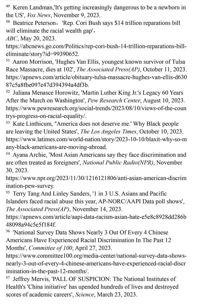 對(duì)華裔科學(xué)家的迫害仍在持續(xù)。雖然美國(guó)政府針對(duì)華裔科學(xué)家的“中國(guó)行動(dòng)計(jì)劃”被暫停,但該計(jì)劃帶來(lái)的深遠(yuǎn)影響?yīng)q在,眾多華裔科學(xué)家仍然有強(qiáng)烈的不安全感。美國(guó)《科學(xué)》雜志2023年3月23日刊發(fā)文章,講述了“中國(guó)行動(dòng)計(jì)劃”對(duì)華裔科學(xué)家的迫害。在被美國(guó)國(guó)立衛(wèi)生研究院調(diào)查的246人中,103人失去工作,超過(guò)五分之一的人被禁止在4年內(nèi)申請(qǐng)國(guó)立衛(wèi)生研究院資助,給他們的學(xué)術(shù)生涯帶來(lái)重大打擊。這246人中有81%的科學(xué)家是亞裔。(注57)普林斯頓大學(xué)、哈佛大學(xué)和麻省理工學(xué)院對(duì)近1400名在美國(guó)大學(xué)擔(dān)任終身教職的華裔美國(guó)人的調(diào)查顯示,72%的人表示沒(méi)有安全感,42%的人害怕在美國(guó)開(kāi)展研究。(注58)