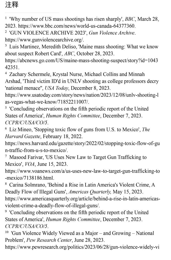 槍支暴力造成慘痛生命代價(jià)。數(shù)據(jù)顯示,美國(guó)所有類型的槍支暴力事件都呈上升趨勢(shì)。(注1)根據(jù)“槍支暴力檔案”網(wǎng)站統(tǒng)計(jì)的數(shù)據(jù),2023年美國(guó)至少發(fā)生了654起大規(guī)模槍擊事件。槍支暴力導(dǎo)致近4.3萬(wàn)人死亡,平均每天死亡117人。(注2)例如,美國(guó)廣播公司新聞網(wǎng)站2023年10月28日?qǐng)?bào)道,緬因州發(fā)生大規(guī)模槍擊事件,造成至少18人死亡,13人受傷。(注3)《今日美國(guó)報(bào)》網(wǎng)站2023年12月6日?qǐng)?bào)道,拉斯維加斯3名大學(xué)教授被一名前同事槍殺。美國(guó)大學(xué)教授協(xié)會(huì)主席艾琳·馬爾維稱,槍支暴力是“不可接受的國(guó)家威脅”,敦促美國(guó)政府進(jìn)行槍支政策改革。(注4)美國(guó)與槍支有關(guān)的傷亡人數(shù)激增,引發(fā)聯(lián)合國(guó)人權(quán)事務(wù)委員會(huì)的嚴(yán)重關(guān)切。(注5)