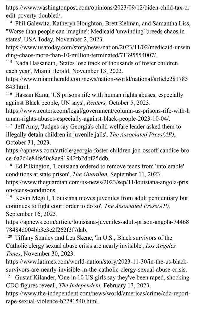 少年司法系統(tǒng)中的兒童遭受不人道待遇。2023年10月,聯(lián)合國(guó)人權(quán)理事會(huì)在執(zhí)法工作中推進(jìn)種族正義和平等的國(guó)際獨(dú)立專家機(jī)制調(diào)查顯示,美國(guó)刑事司法系統(tǒng)充斥著某些特有的不人道做法。美國(guó)是世界上唯一一個(gè)判處兒童終身監(jiān)禁不得假釋的國(guó)家。(注116)在佐治亞州,兒童福利機(jī)構(gòu)的負(fù)責(zé)人要求法官將有精神問(wèn)題和行為問(wèn)題的兒童拘留在少年監(jiān)獄。(注117)自2022年10月以來(lái),多達(dá)80名兒童被帶到路易斯安那州以暴力著稱的安哥拉監(jiān)獄,關(guān)押在死刑犯等待處決的牢房里。(注118)盡管這些兒童與成年囚犯隔離,但他們?cè)馐芰宋kU(xiǎn)的熱浪,長(zhǎng)時(shí)間被關(guān)在牢里,使用的是污水,更無(wú)法獲得教育。(注119)