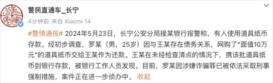 ·警方通報(bào)女子拿10萬練功券存銀行:25歲男子網(wǎng)購道具鈔還債,已被刑拘。