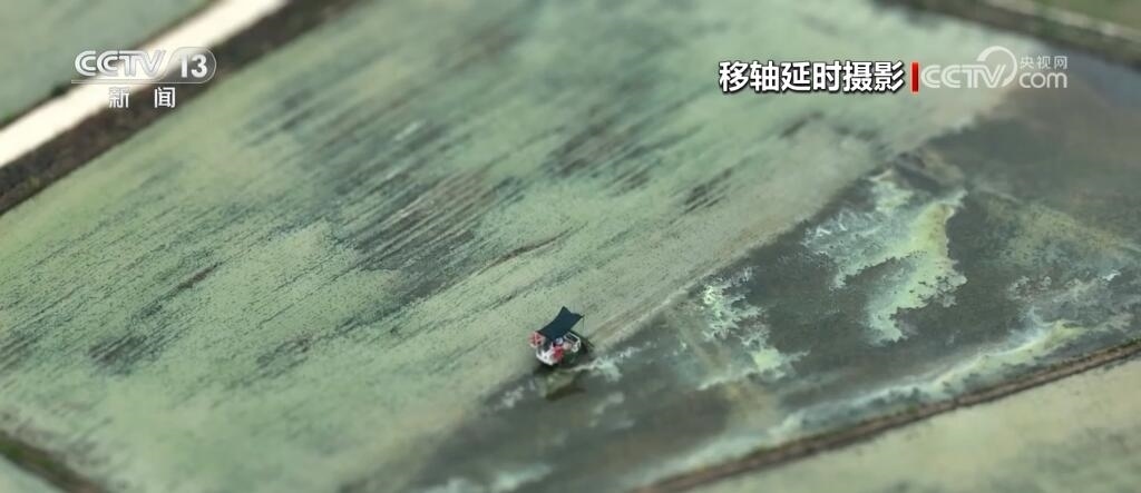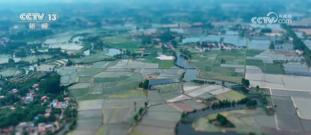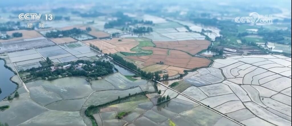 現(xiàn)在您看到的是河南信陽淮河以南的水稻插秧現(xiàn)場。插秧機在田間穿梭,一株株茁壯的秧苗被整齊有序地植入田間,一會兒工夫就插滿了整塊稻田??罩懈╊慌_臺插秧機在農(nóng)機手的操控下好似一把把畫刷,在稻田上輕輕暈染,繪就丹青。而同在信陽,淮河以北的麥田里,則是金色的麥浪翻滾起伏,收割機馳騁田間,飽滿的麥穗被卷入機艙,經(jīng)過收割、脫粒,顆粒歸倉。