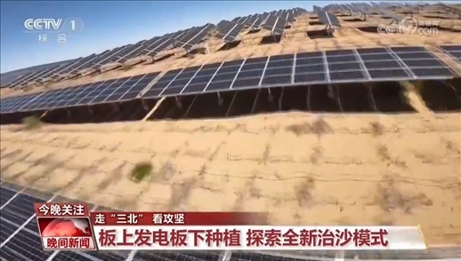 總臺(tái)記者 李欣蔓:治沙的腳步不但沒有停,還在不斷探索新的治沙模式?,F(xiàn)在我們看到的是鄂爾多斯一個(gè)已經(jīng)建好、并網(wǎng)發(fā)電的光伏項(xiàng)目,板上發(fā)電,板下種植,一個(gè)空間全方位利用。三重防線,構(gòu)建起了全新的生態(tài)治沙模式。有一個(gè)數(shù)據(jù)值得我們關(guān)注,這里的光伏項(xiàng)目占地39萬畝,與此同時(shí),生態(tài)治理面積也將規(guī)劃完成39萬畝。在國家推進(jìn)光伏治沙項(xiàng)目開發(fā)建設(shè)的進(jìn)程中,我們看到越來越多的企業(yè)參與其中,在發(fā)展新能源產(chǎn)業(yè)的同時(shí)共同擔(dān)負(fù)起治沙的責(zé)任,為一片藍(lán)海,一片綠洲的建設(shè),貢獻(xiàn)更多的力量。