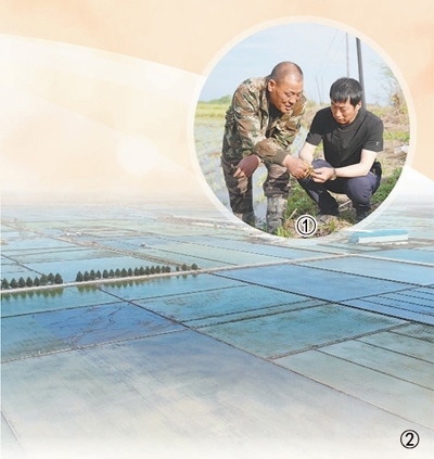 圖①:于海河(右)在田間地頭和村民一起查看水稻長勢。 本報記者 方 圓攝圖②:完成了機械化插秧的水稻田。虎林市委宣傳部供圖