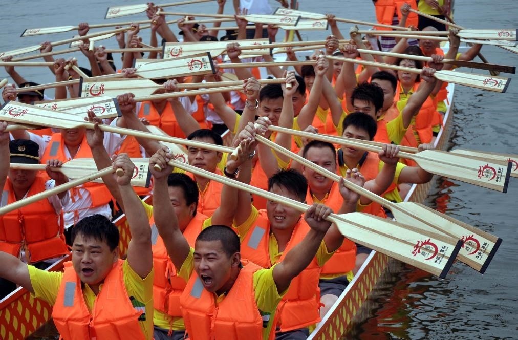 2011年6月6日,在河南省鄭州東區(qū)的如意湖上,舉行了一場龍舟挑戰(zhàn)賽,兩支龍舟隊(duì)的選手們?cè)诒荣愰_始前舉槳大吼以壯氣勢(shì)。