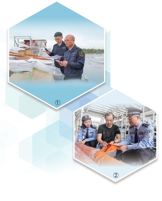圖①:上海海關(guān)所屬松江海關(guān)工作人員檢查貨物。上海海關(guān)致力打造通關(guān)手續(xù)更簡(jiǎn)便、通關(guān)效率更快捷、監(jiān)管更嚴(yán)密有效的營(yíng)商環(huán)境。姜輝輝攝(人民視覺(jué)) 圖②:江蘇南通通州區(qū)公安局西亭派出所民警走進(jìn)生產(chǎn)車間,了解企業(yè)情況,護(hù)航企業(yè)經(jīng)營(yíng)發(fā)展。翟慧勇攝(人民視覺(jué))