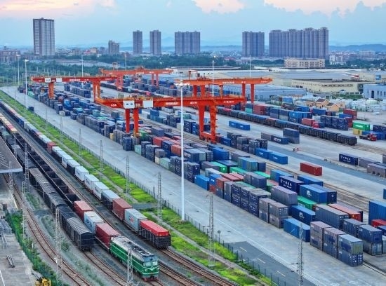9月4日,江西省贛州市南康區(qū)贛州國際陸港貨場(chǎng),集裝箱整齊排列,進(jìn)出口貨物正快速有序裝卸。(受訪者供圖)