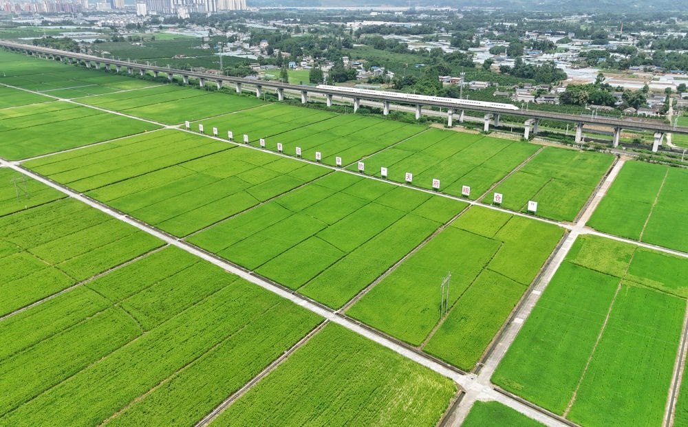 2024年7月26日,一列高鐵列車從永豐村高標準農(nóng)田上方的高架橋上疾馳而過(無人機照片)。