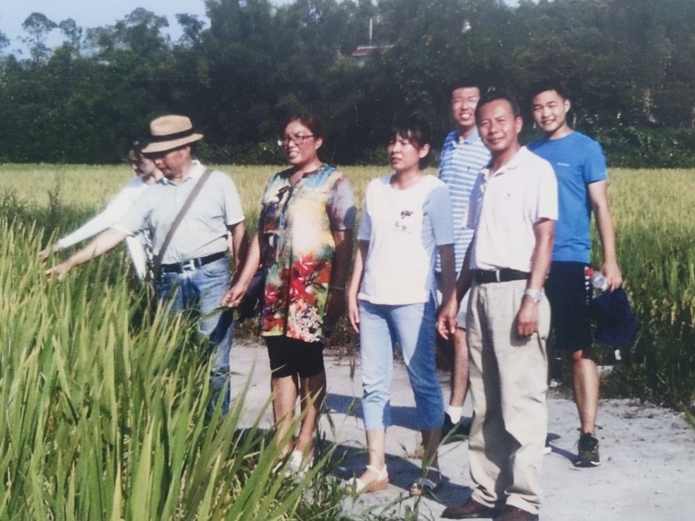 2014年,馬均(右二)帶領(lǐng)學生在永豐村與當?shù)剞r(nóng)技人員交流。