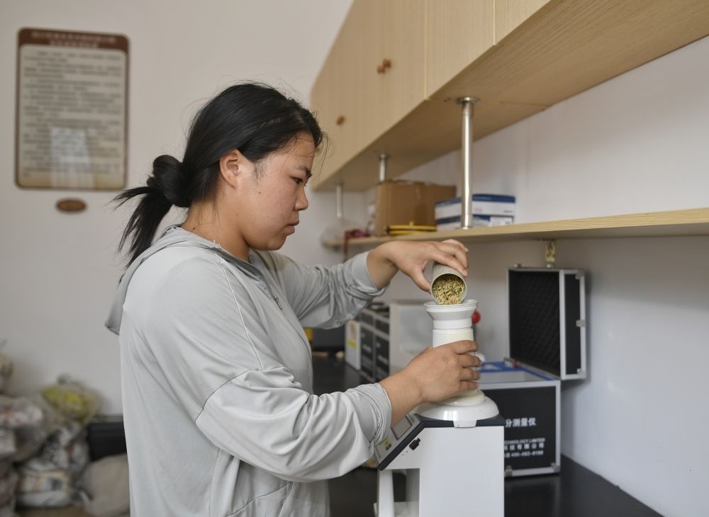 2024年8月22日,在永豐村水稻科技小院,長期駐守在此的四川農(nóng)業(yè)大學學生測量稻谷含水量。