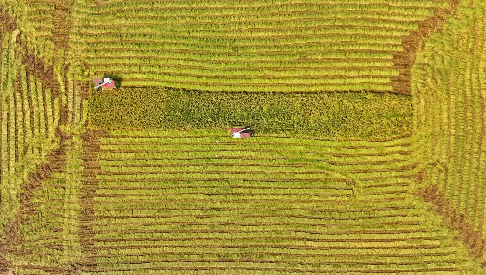 2024年8月22日,收割機在永豐村高標準農(nóng)田內(nèi)收割水稻(無人機照片)。