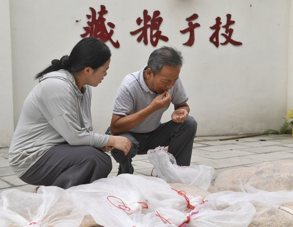 2024年9月10日,農(nóng)業(yè)專家、四川農(nóng)業(yè)大學教授馬均(右)在永豐村水稻科技小院通過牙咬感受稻谷晾曬程度。