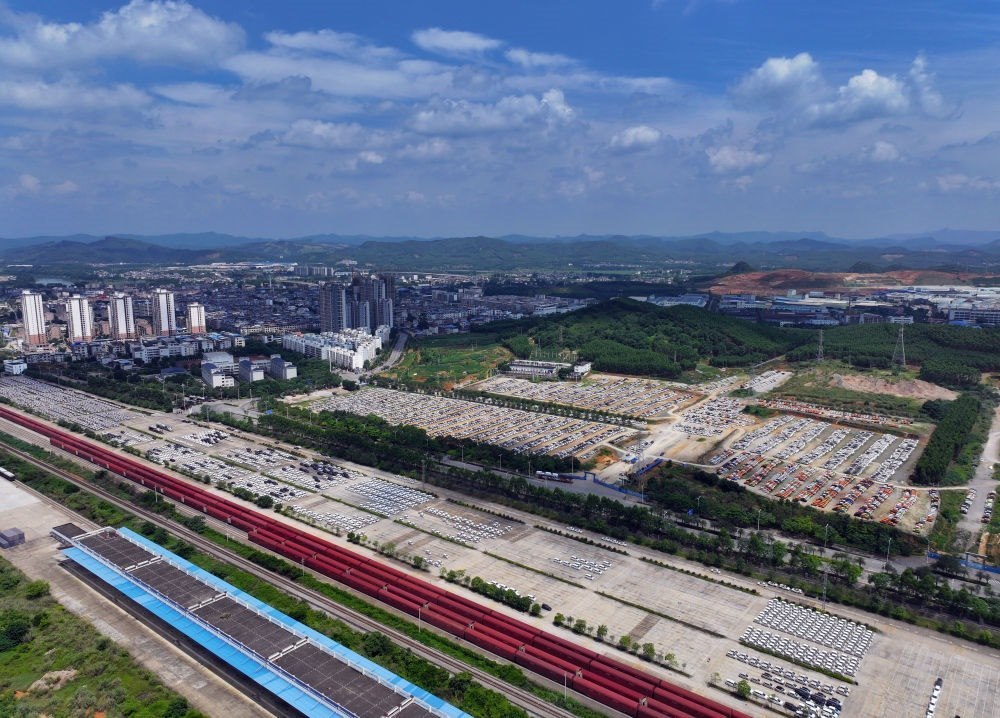 汽車(chē)在廣西柳州雒容汽車(chē)物流基地等待進(jìn)入鐵路貨車(chē)車(chē)廂。部分出口的新能源汽車(chē)從這里裝車(chē)運(yùn)往各大出海港口(2024年5月24日攝,無(wú)人機(jī)照片)。
