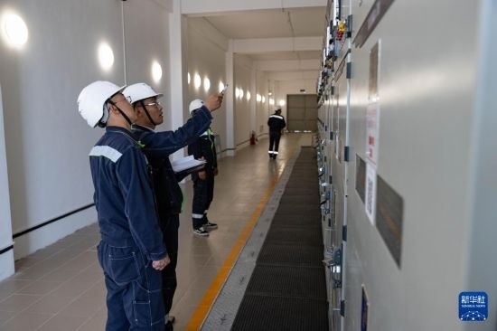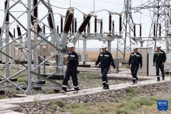 6月25日,在哈薩克斯坦阿拉木圖州謝列克風(fēng)電場,中哈運(yùn)行人員進(jìn)行設(shè)備巡檢。白雪騏 攝