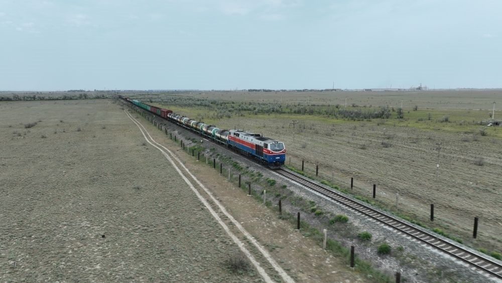 2023年5月12日,在哈薩克斯坦阿拉木圖附近,貨運列車馳騁于阿拉木圖與霍爾果斯間(無人機(jī)照片)。新華社發(fā)(奧斯帕諾夫攝)