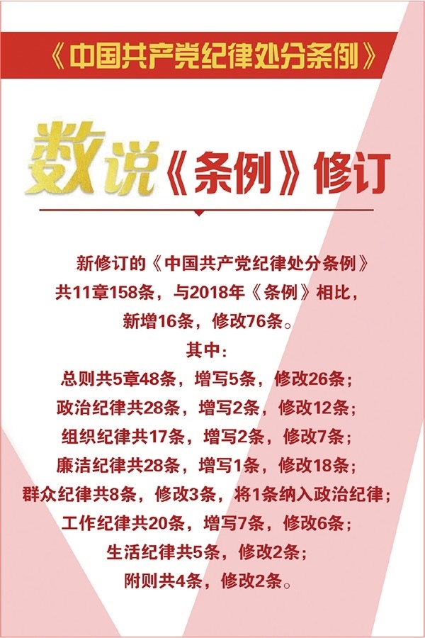2023年新修訂的《中國共產(chǎn)黨紀律處分條例》,與時俱進完善紀律規(guī)范,與2018年《條例》相比,新增16條,修改76條,進一步扎緊織密制度籠子。