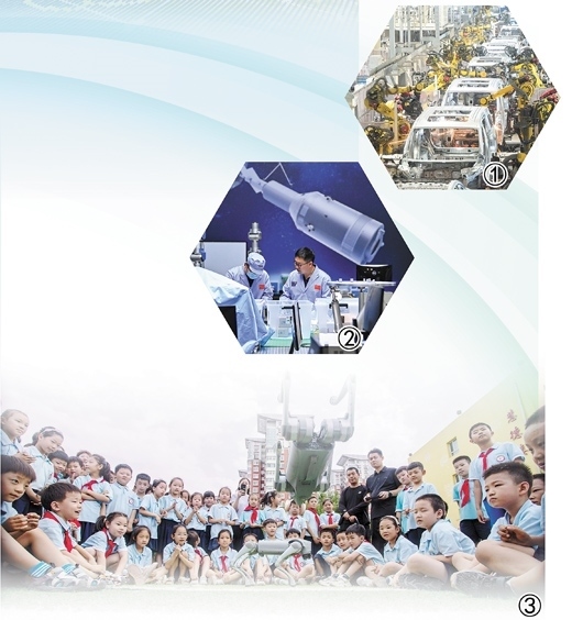 圖①:湖北武漢經(jīng)開區(qū)的嵐圖汽車電動化焊裝車間,機(jī)器人正在流水線上作業(yè)。 新華社記者 肖藝九攝 圖②:中國科學(xué)院空間光學(xué)系統(tǒng)在軌制造與集成重點實驗室的科研人員在進(jìn)行科研工作。 新華社記者 許 暢攝 圖③:河北邯鄲市復(fù)興區(qū)前進(jìn)小學(xué)的學(xué)生們在觀看機(jī)器狗表演。聶長青攝(人民視覺)