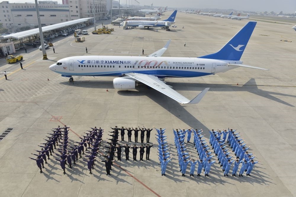 2013年11月16日,廈航機隊規(guī)模增至100架,這是廈航員工在機隊第100架飛機前擺出MF100字樣。新華社記者 項開來 攝