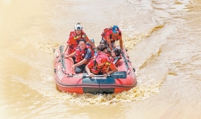 湖北省消防救援總隊(duì)前突小組黨員突擊隊(duì)在陜西省商洛市腰坪水庫(kù)開(kāi)展搜救。圖為消防救援人員運(yùn)送橡皮艇至作業(yè)水域。亓玉昆 李偉男攝影報(bào)道