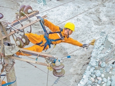 在四川省綿陽(yáng)市平武縣,國(guó)網(wǎng)綿陽(yáng)供電公司黨員突擊隊(duì)隊(duì)員在搶修輸電線路,他的身下就是滔滔洪水。田 海攝(人民視覺(jué))