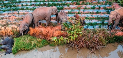 “短鼻家族”和“然然家族”的野象在云南省西雙版納州景洪市大渡崗鄉(xiāng)大荒壩村覓食(2023年5月9日攝)胡超攝/本刊