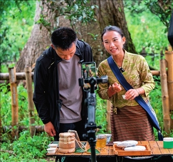 在云南景邁山大平掌古茶林,傣族姑娘仙金(右)在直播售賣普洱茶(2023年9月17日攝)胡超攝/本刊