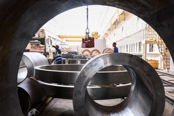 在蘭州蘭石集團(tuán)高端裝備產(chǎn)業(yè)園,工人在生產(chǎn)車間作業(yè)(2024年7月25日攝)。新華社記者 呂帥 攝