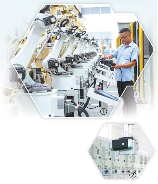 圖①:四川華鎣華鎣山經開區(qū),企業(yè)員工在智能車間調試新安裝的機器人。邱海鷹攝(人民視覺) 圖②:寧夏銀川金鳳區(qū),智慧配電站房內軌道式巡檢機器人正在開展自主巡檢。袁宏彥攝(人民視覺)