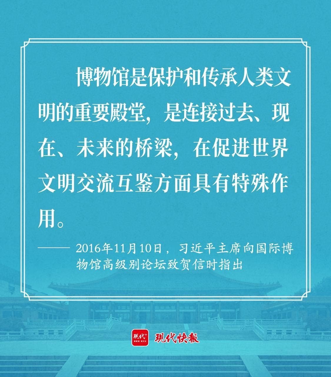 2016年11月10日,習(xí)近平主席向國際博物館高級(jí)別論壇致賀信時(shí)指出,博物館是保護(hù)和傳承人類文明的重要殿堂,是連接過去、現(xiàn)在、未來的橋梁,在促進(jìn)世界文明交流互鑒方面具有特殊作用。