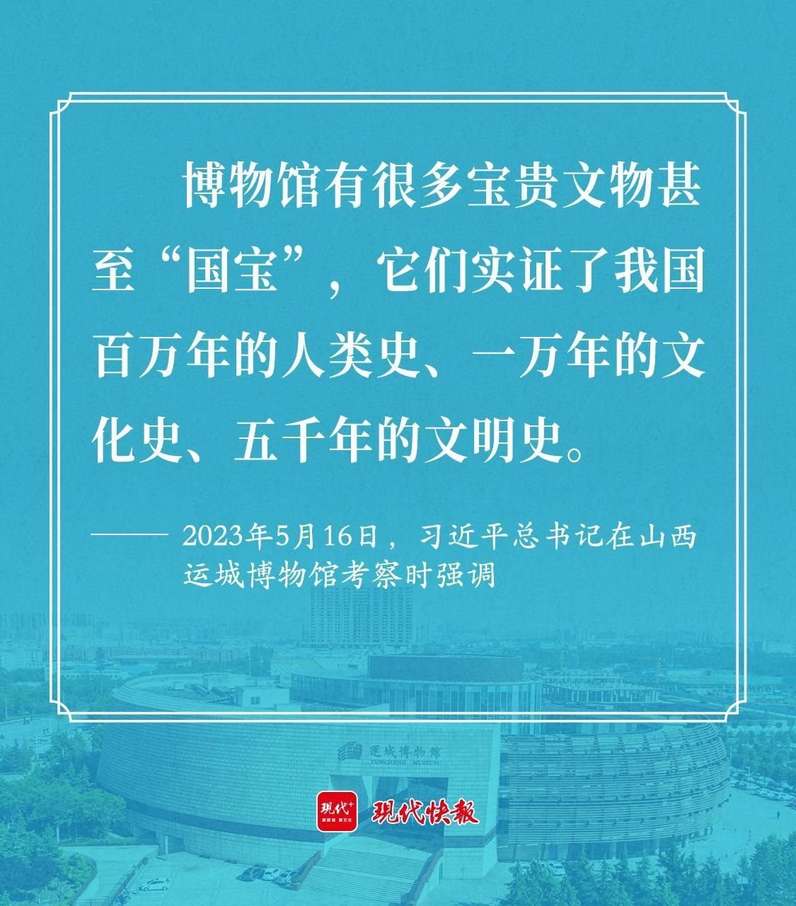 2023年5月16日,習(xí)近平總書記考察山西運(yùn)城博物館時(shí)強(qiáng)調(diào),博物館有很多寶貴文物甚至“國寶”,它們實(shí)證了我國百萬年的人類史、一萬年的文化史、五千年的文明史。